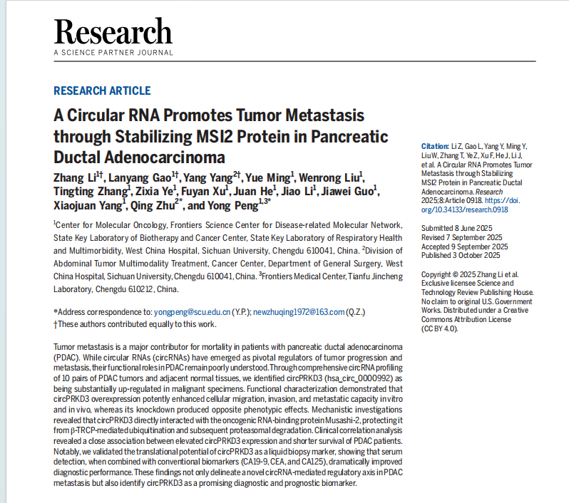 近日,课题组李张博士在《Chinese medical journal》发表了综述文章,论述了非编码RNA与蛋白质相互作用在胰腺癌发生发展中的作用。